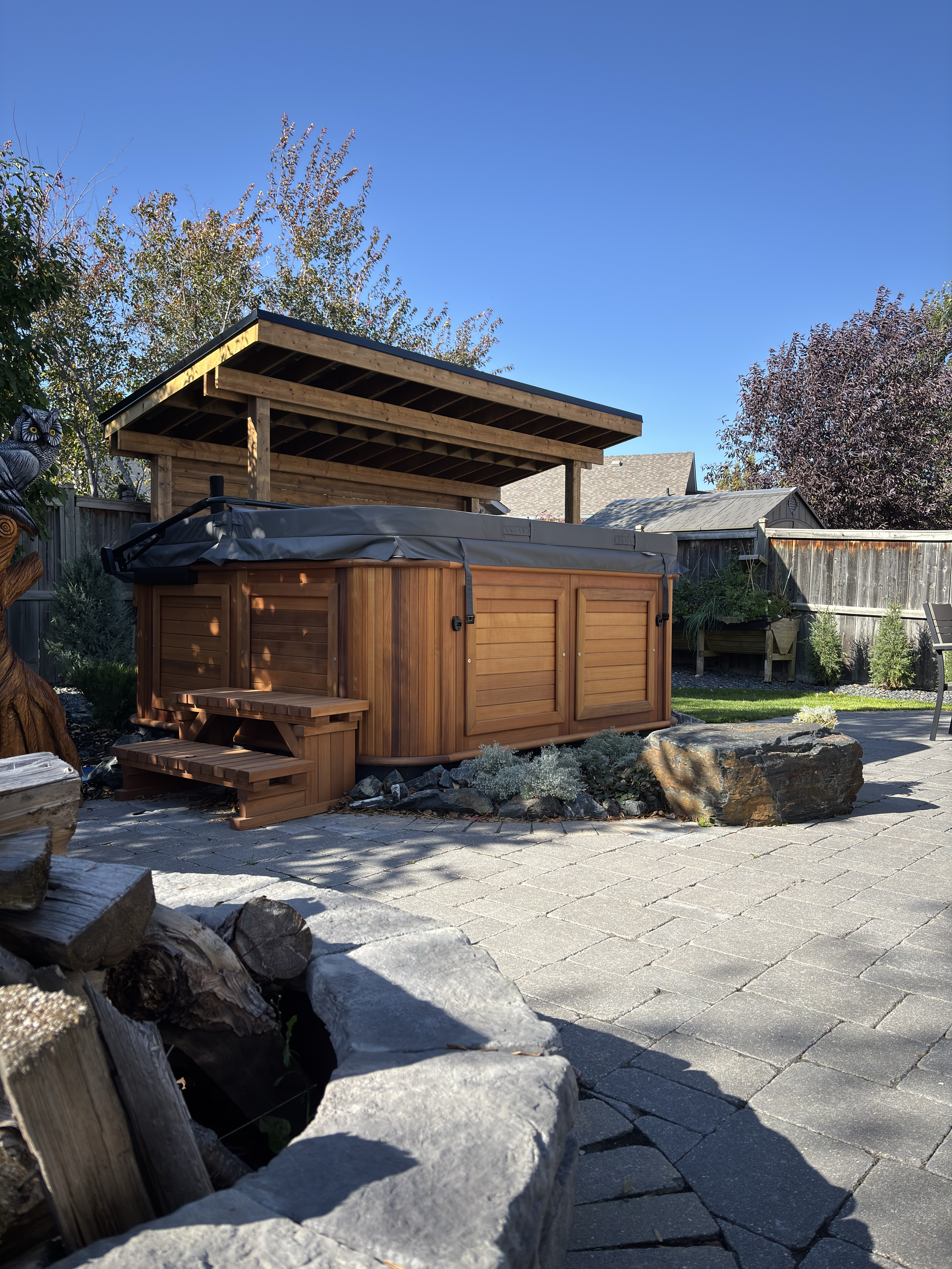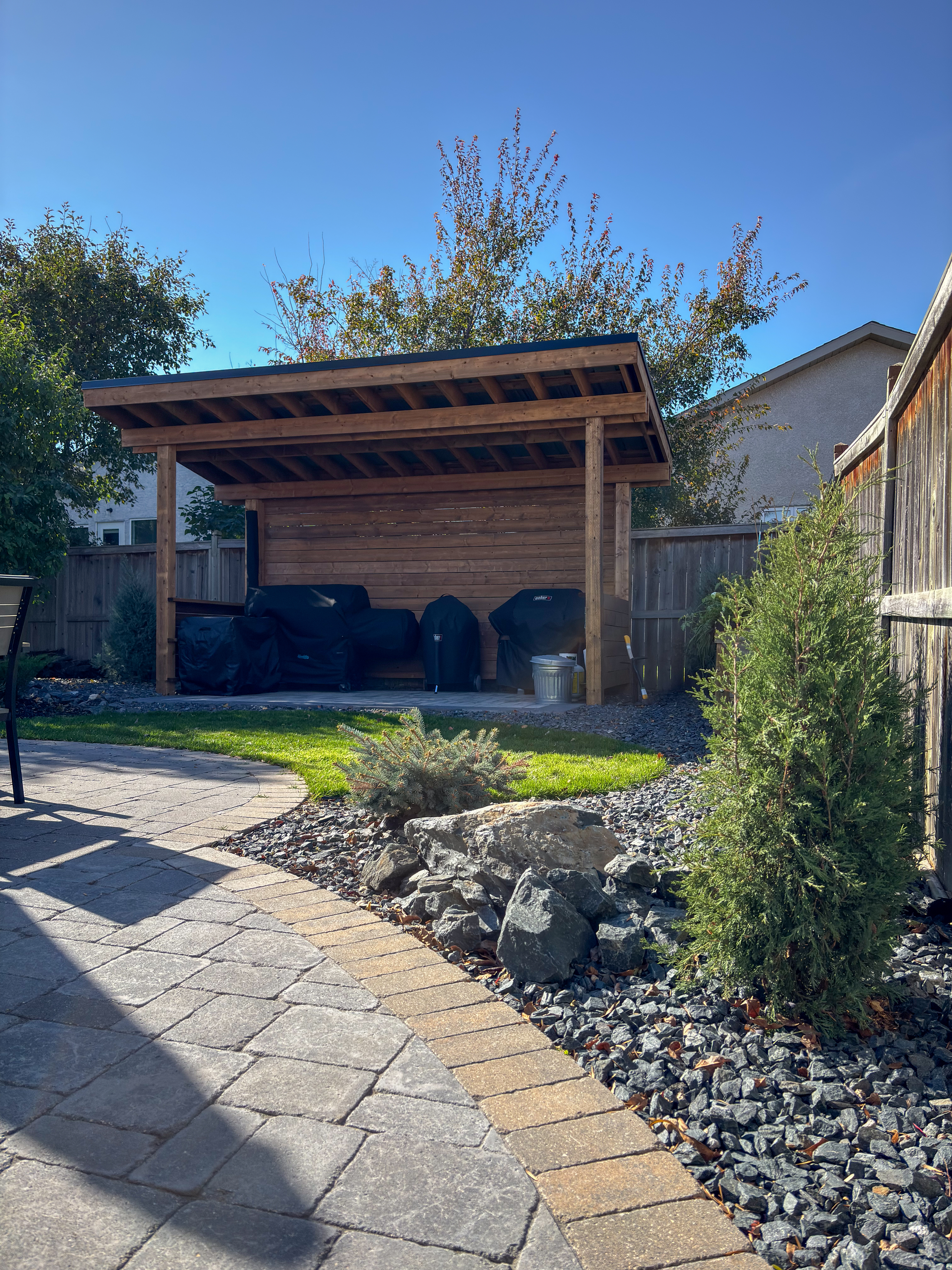 We added a custom pergola to shelter their pellet smoker, upgraded the backyard walkways with pavers, and extended that same attention to detail to the front walkways for a cohesive look throughout the property. To complete the space, evergreens were planted along the back, creating a private, spa-like atmosphere designed for year round enjoyment.