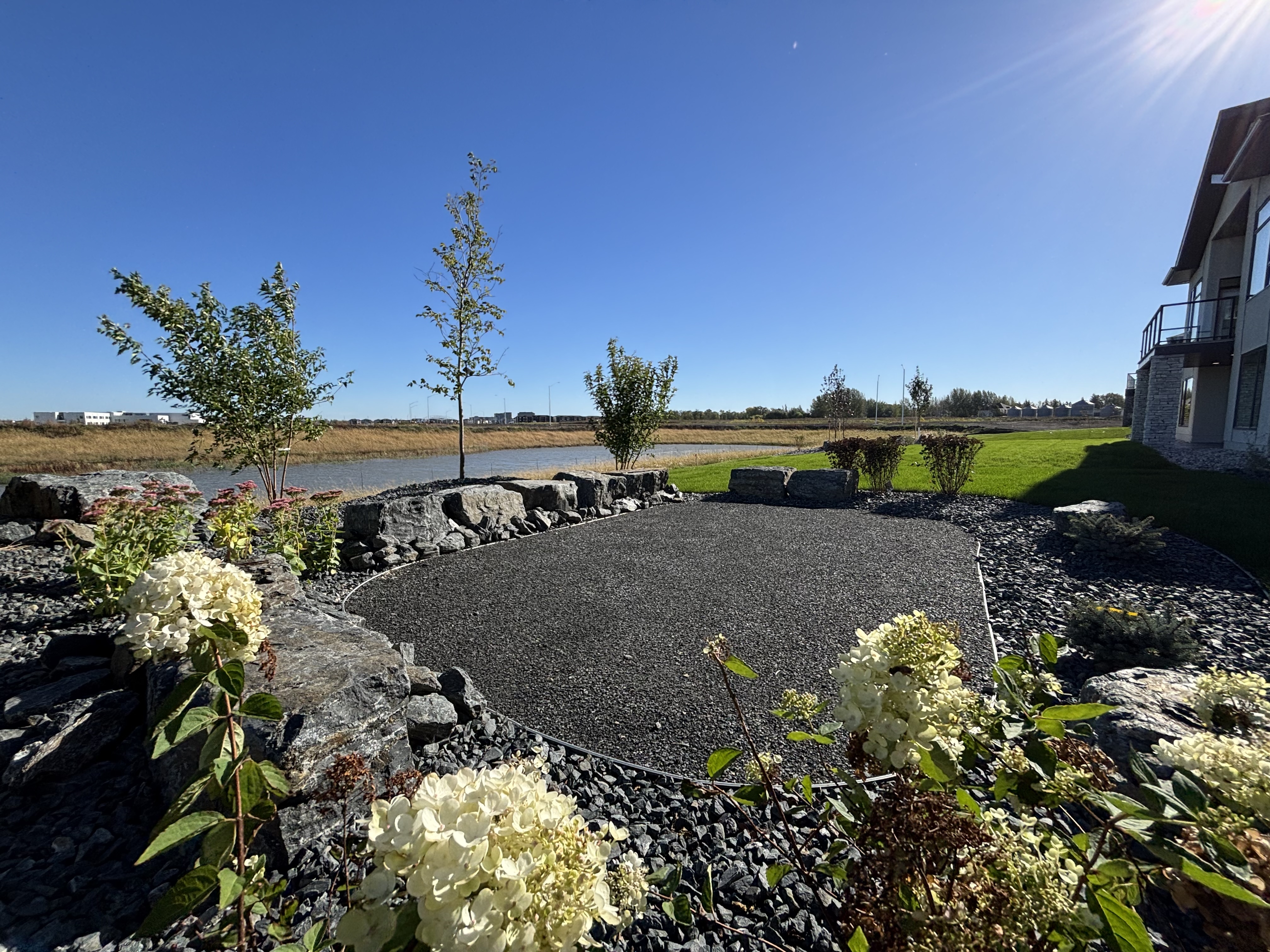 In the backyard, a black crushed granite seating area becomes the focal point, framed by a rock bed. The result is a polished outdoor space that feels finished, functional, and inviting. The perfect design for a new homeowner looking for minimal upkeep and a peaceful place to enjoy the view.